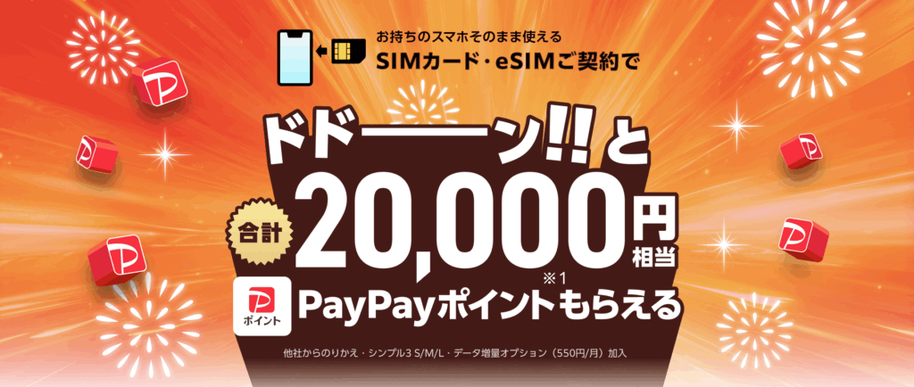 【公式オンラインストア】一括20,000PayPayポイント還元キャンペーン | 【公式オンラインストア限定】 ・シンプル3 M/Lに他社から乗り換えや新規契約などで最大20,000PayPayポイント還元 |
