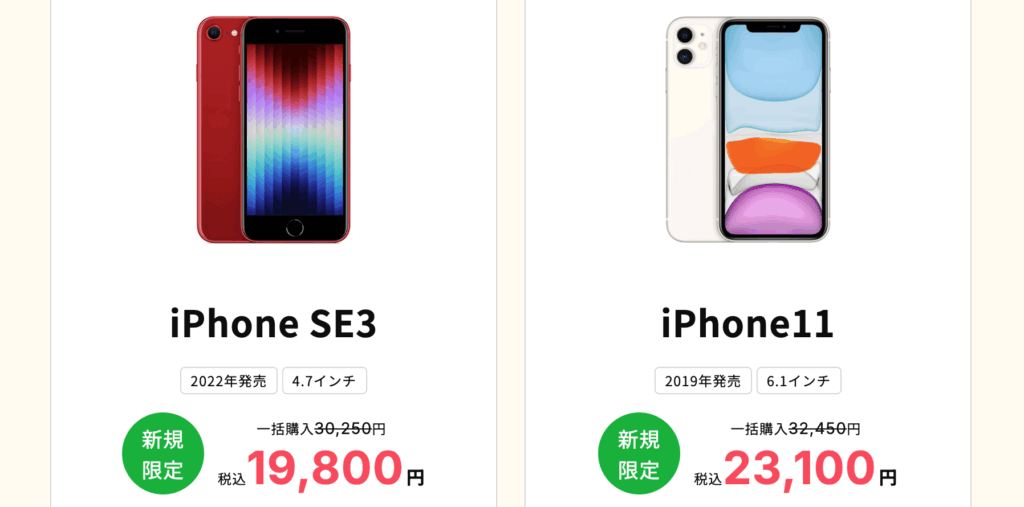 用意されているスマホも機能的に日常利用ならサクサク快適に動作する機種が多いです。たとえば全画面の「iPhone SE3」は19,980円、「iPhone11」は23,100円など、型落ちiPhoneを破格の値段で販売。