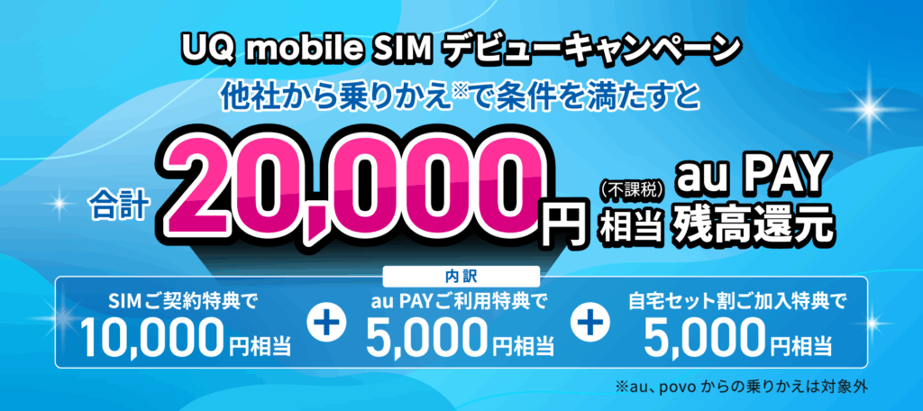 | UQ mobile SIMデビューキャンペーン | 他社からSIMのみ乗り換えで最大20,000円相当のau PAY残高還元 |